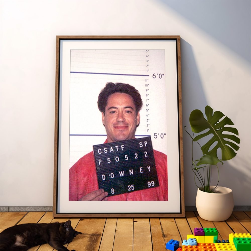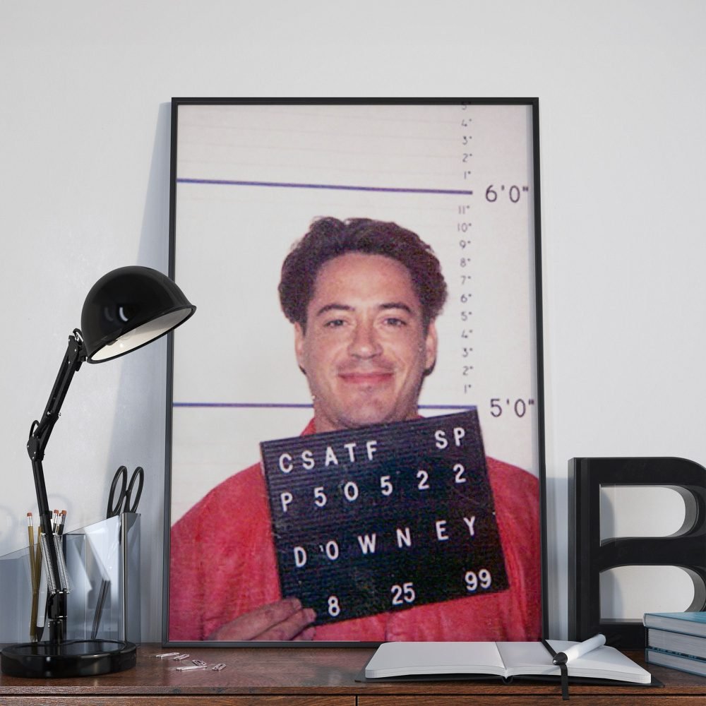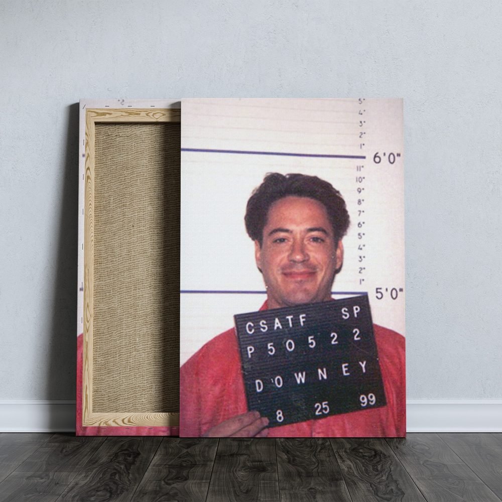 Add a touch of Hollywood intrigue to your decor with our Robert Downey Jr. Mugshot Poster. This captivating canvas wall art print features the celebrity’s police mugshot, offering a unique and edgy portrayal of one of Hollywood’s most charismatic stars. The high-quality canvas brings this momentous snapshot to life, blending the realms of celebrity culture and striking realism.