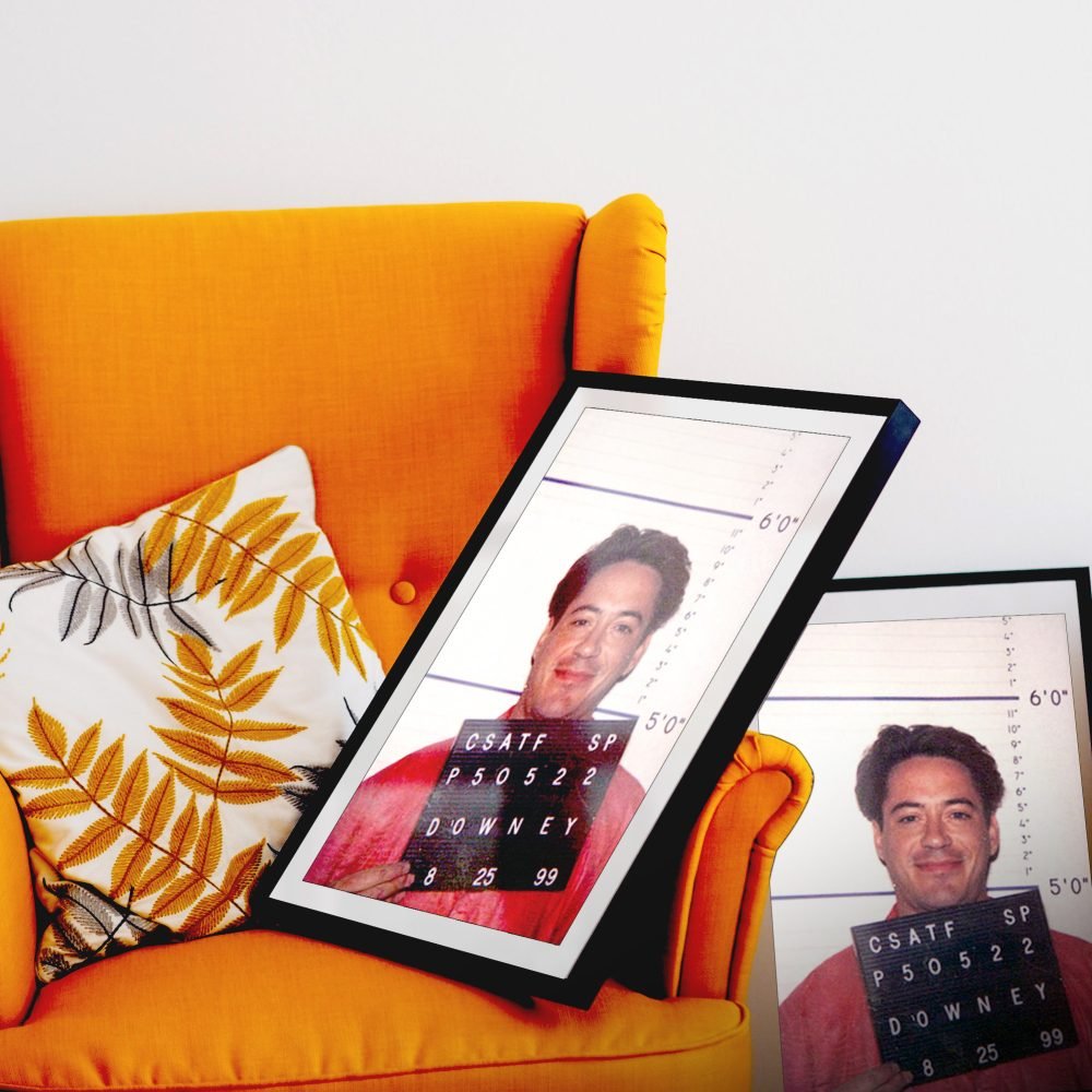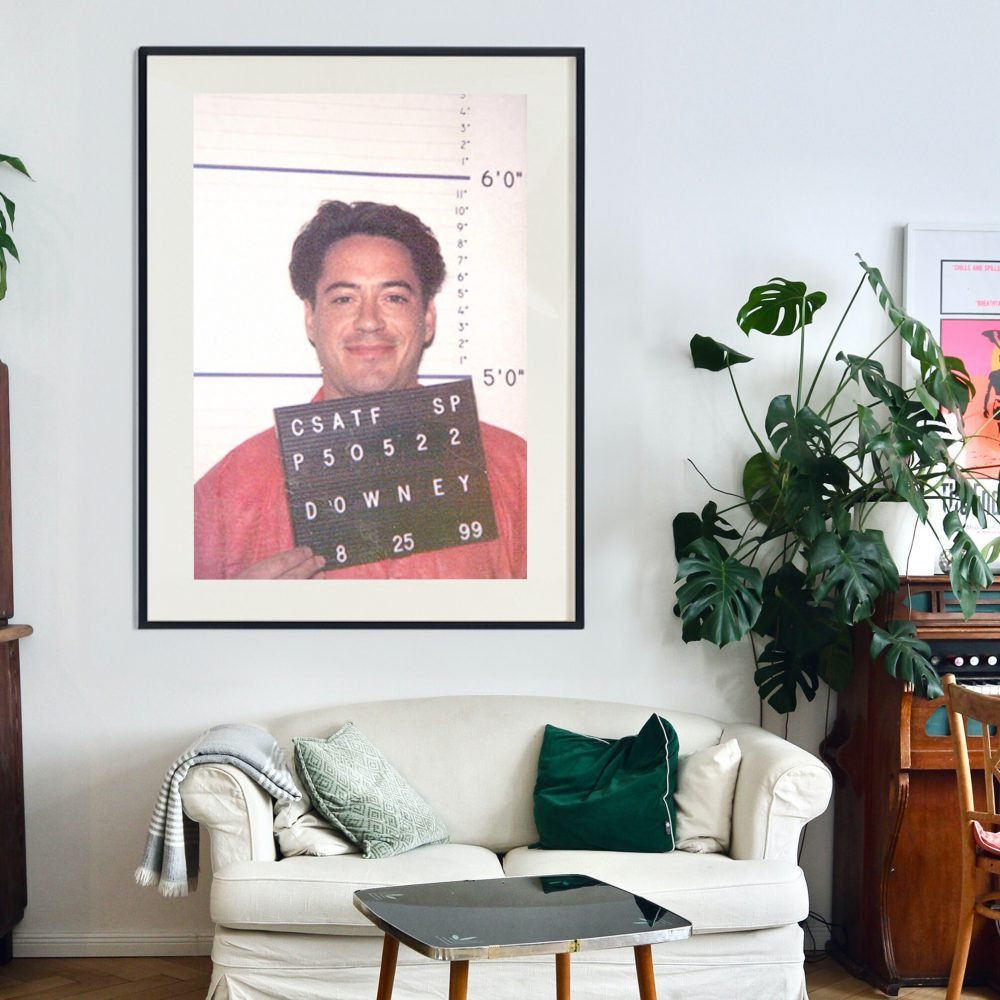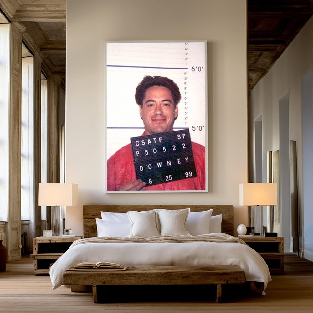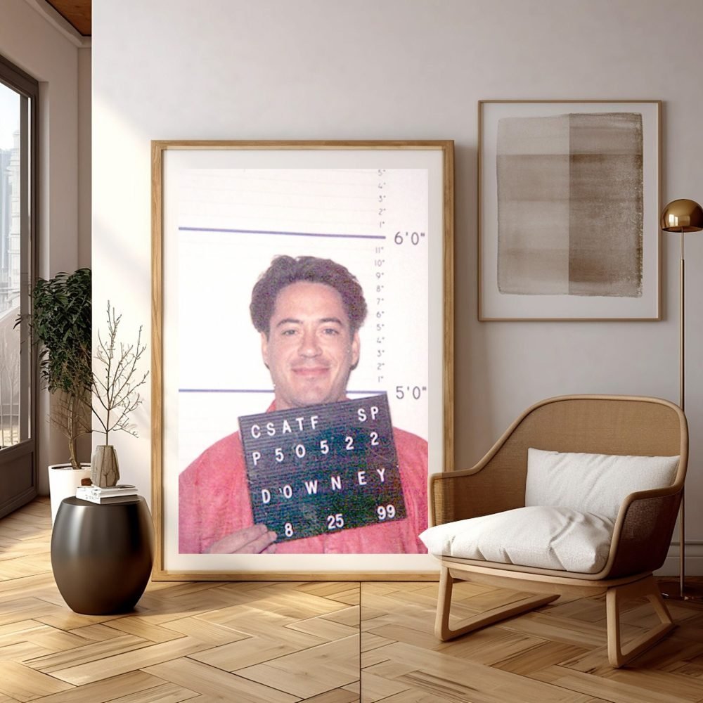 Add a touch of Hollywood intrigue to your decor with our Robert Downey Jr. Mugshot Poster. This captivating canvas wall art print features the celebrity’s police mugshot, offering a unique and edgy portrayal of one of Hollywood’s most charismatic stars. The high-quality canvas brings this momentous snapshot to life, blending the realms of celebrity culture and striking realism.